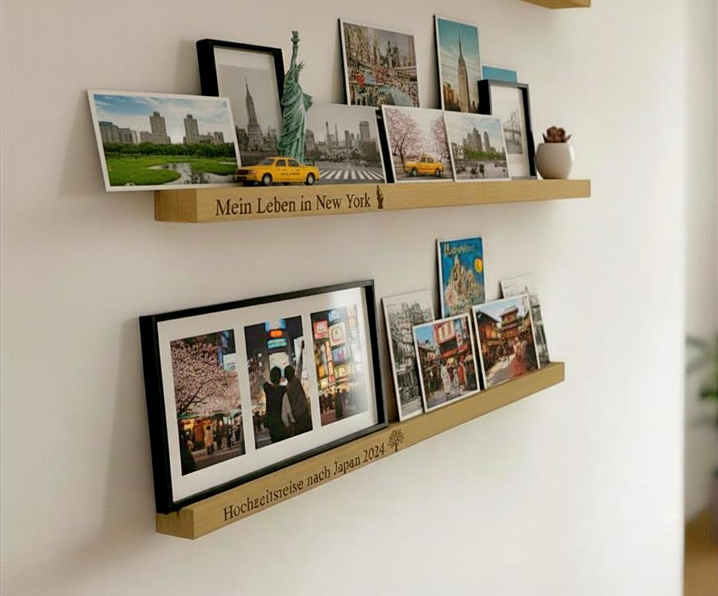 Wunschgravur und personalisierte Bilderleiste - Fotoleiste aus naturbelassenen Eichenholz, verschiedene Formate Wandboard für Bilder