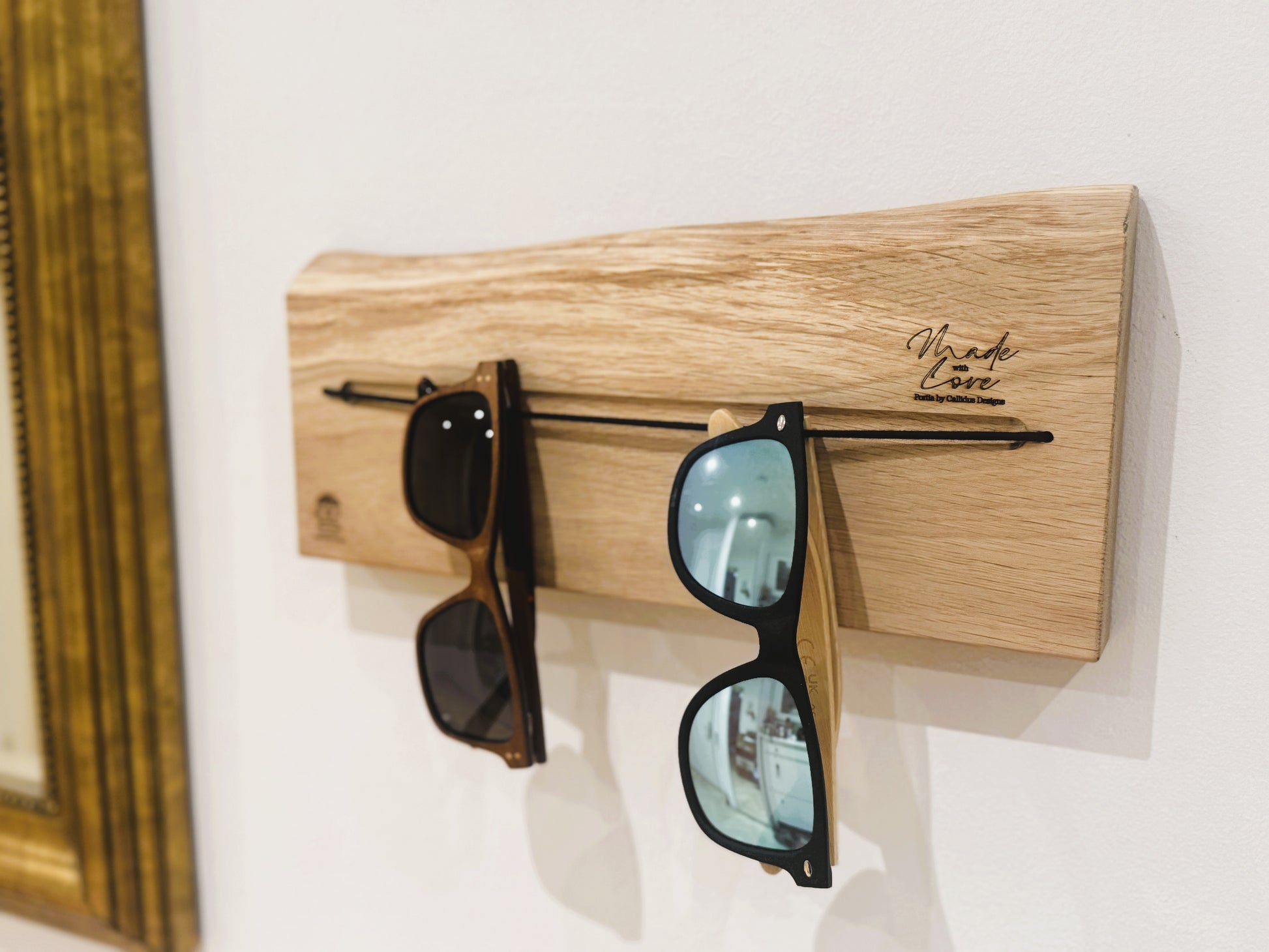 Brillenhalter aus massiver Eiche mit Naturkante – Wandhalterung mit Gummiband für Brillen & Sonnenbrillen