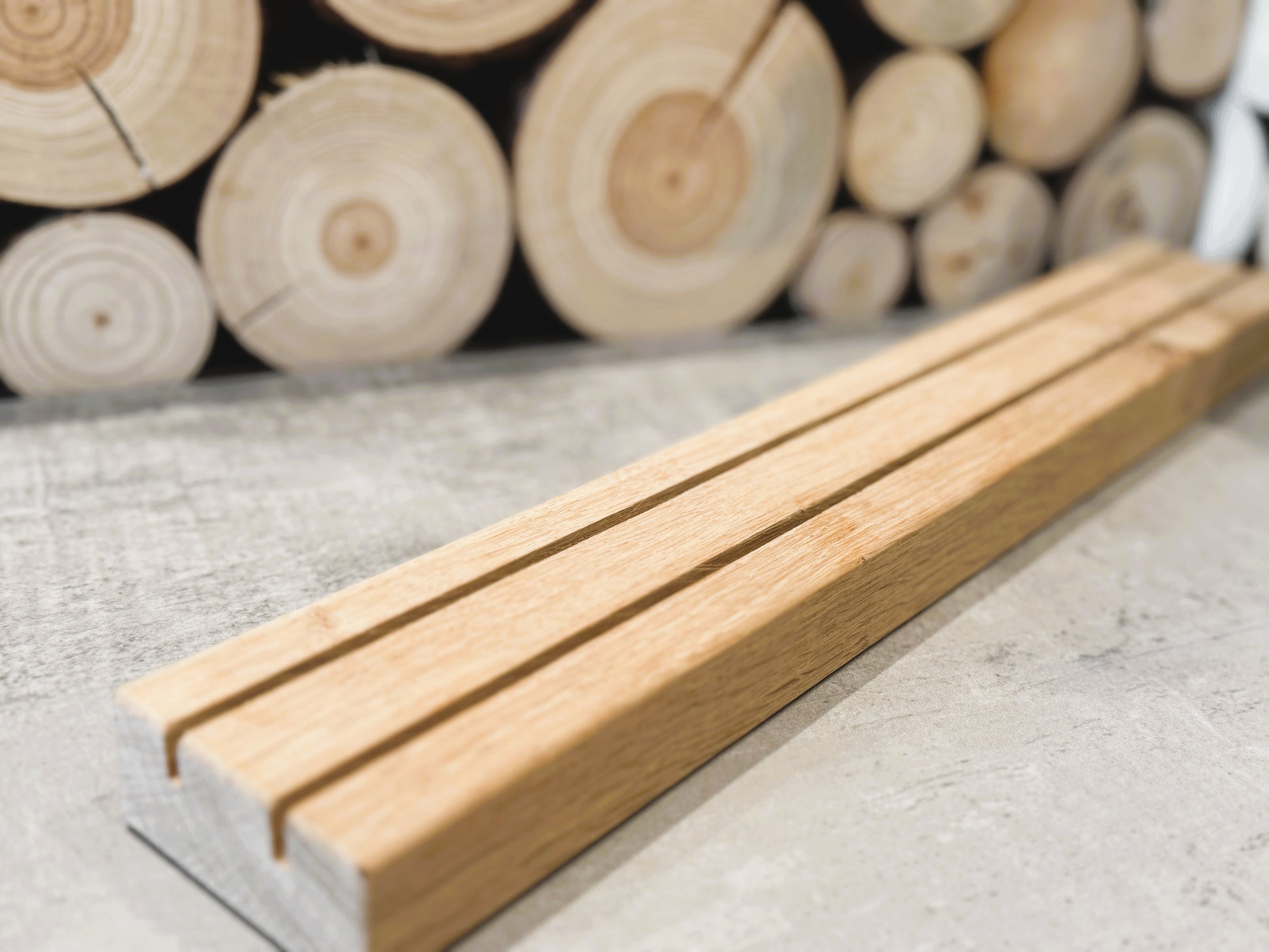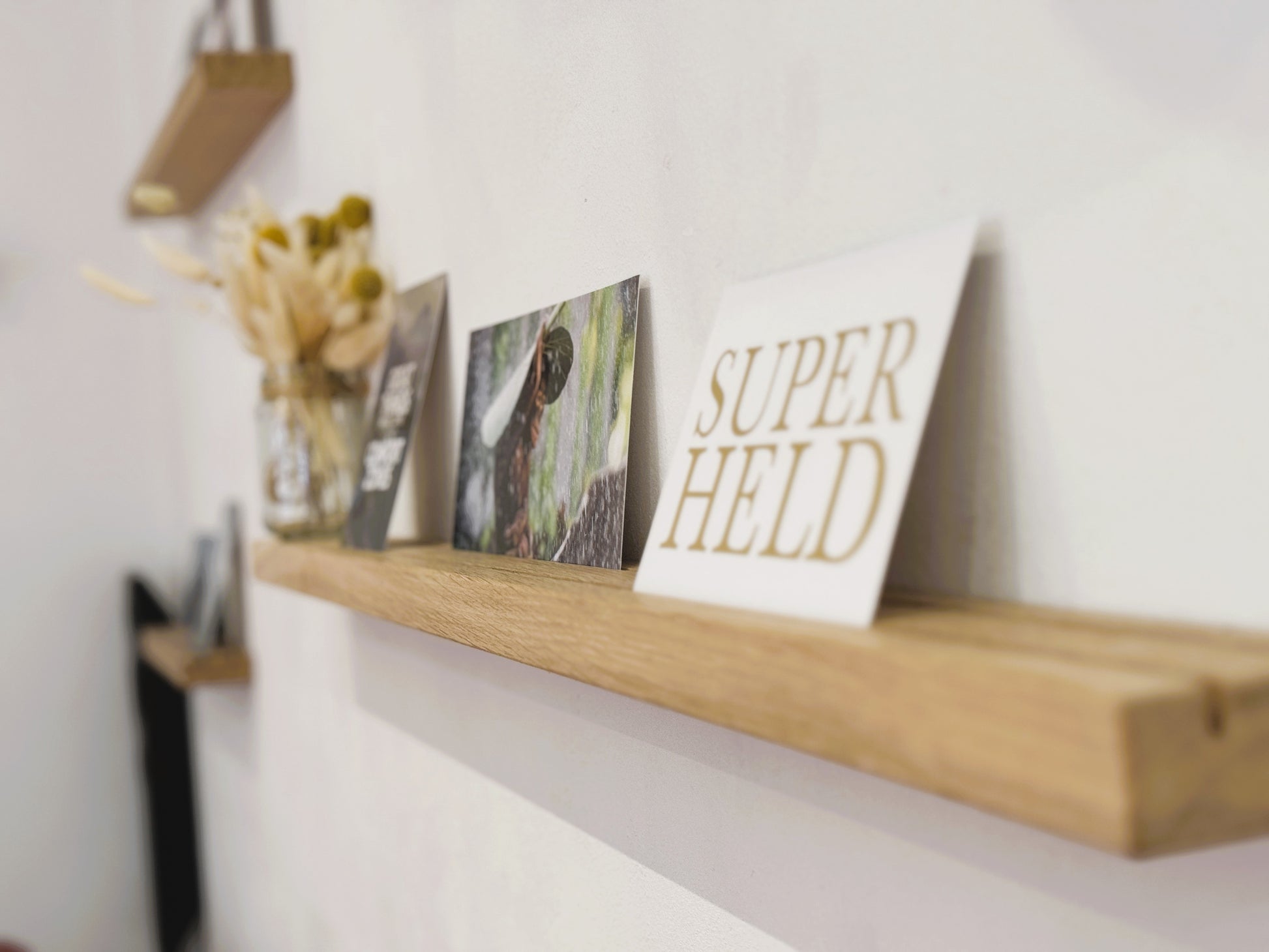Eichenleiste für Fotos und Bilder, Ideal für Postkarten mit doppelter Nut, Bilderleiste aus naturbelassenen Eichenholz, Fotoleiste als Regal