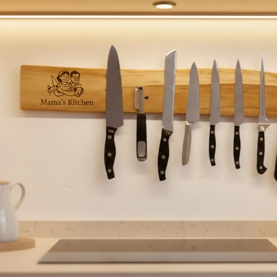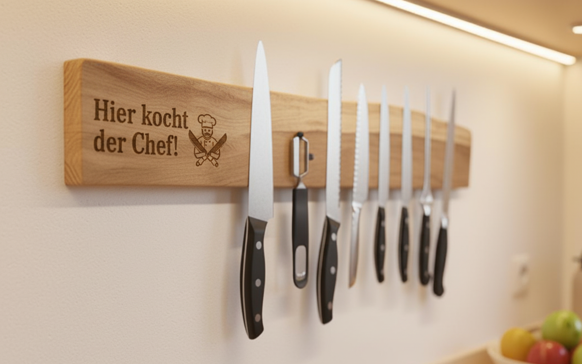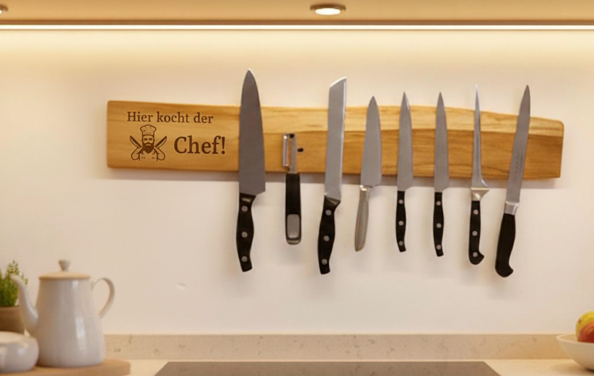 Auf Wunsch kannst du deine Messerleiste mit einer persönlichen Lasergravur versehen lassen – zum Beispiel mit einem Namen, einem Spruch oder einem Firmenlogo.